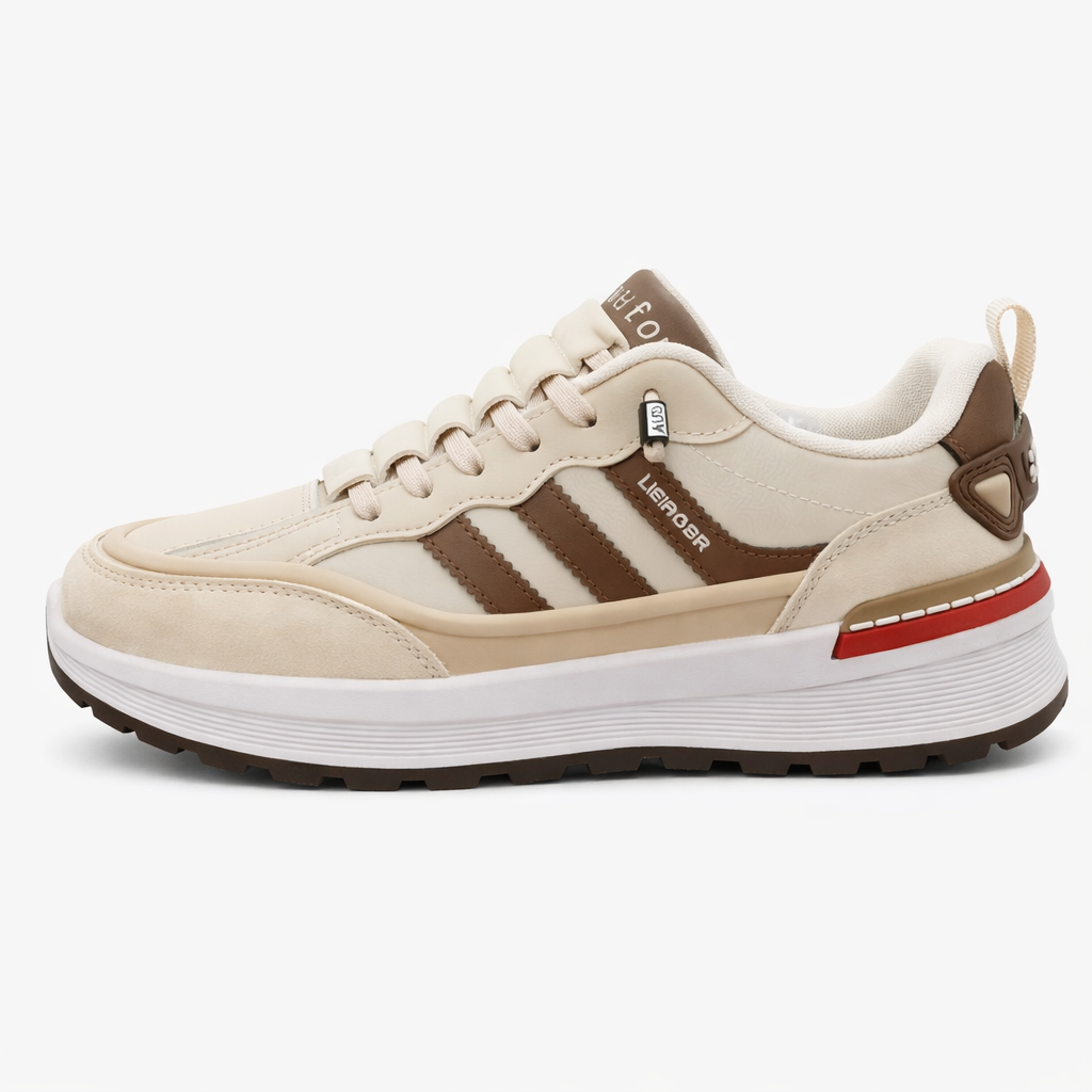 Step up your footwear game with these stylish retro-inspired sneakers. Featuring a cream suede and leather upper, these sneakers offer a perfect blend of comfort and style. The brown leather stripes and red accents on the midsole add a bold touch, while the cushioned insole ensures all-day comfort. Ideal for both casual outings and sporty activities, these sneakers are a must-have addition to your collection.